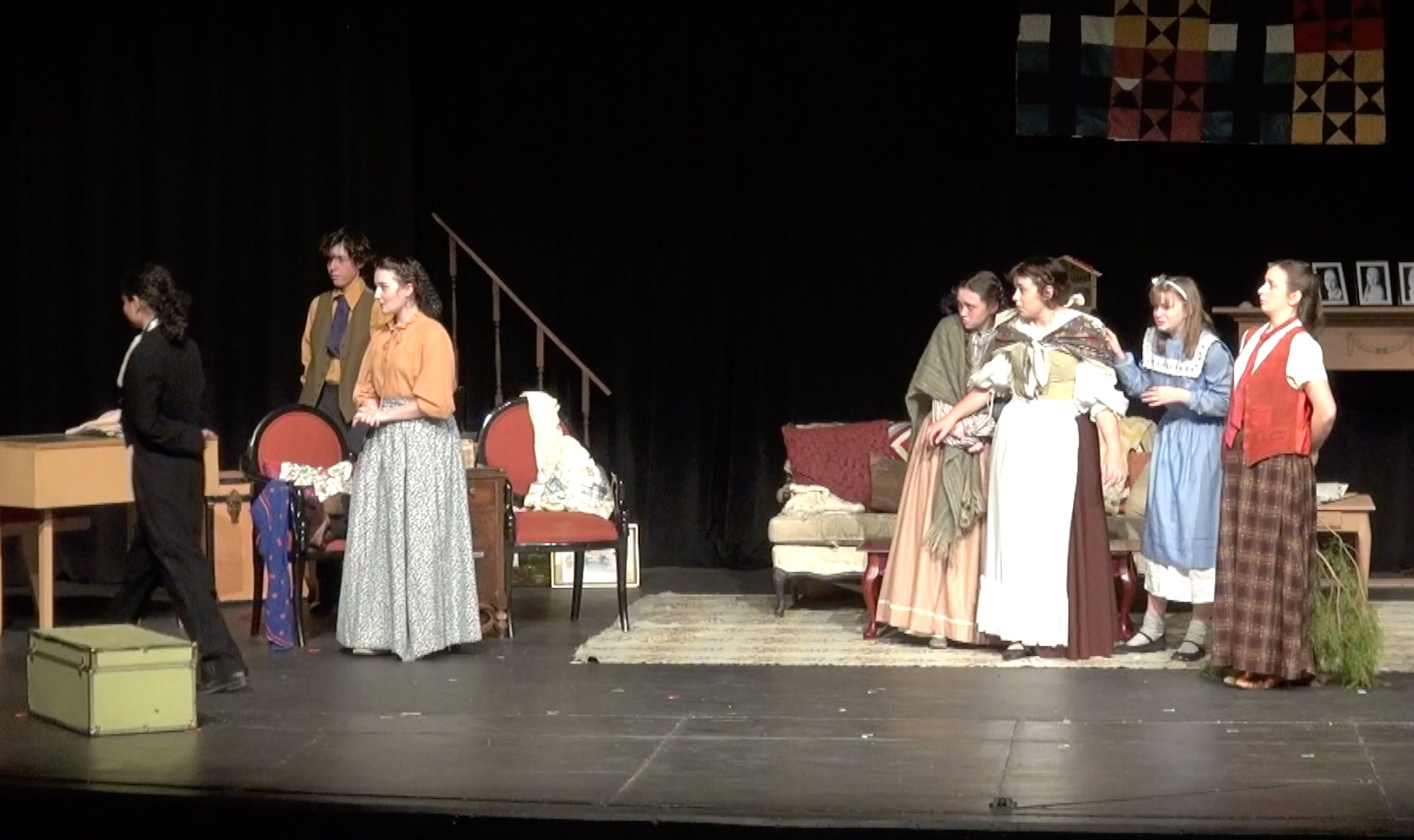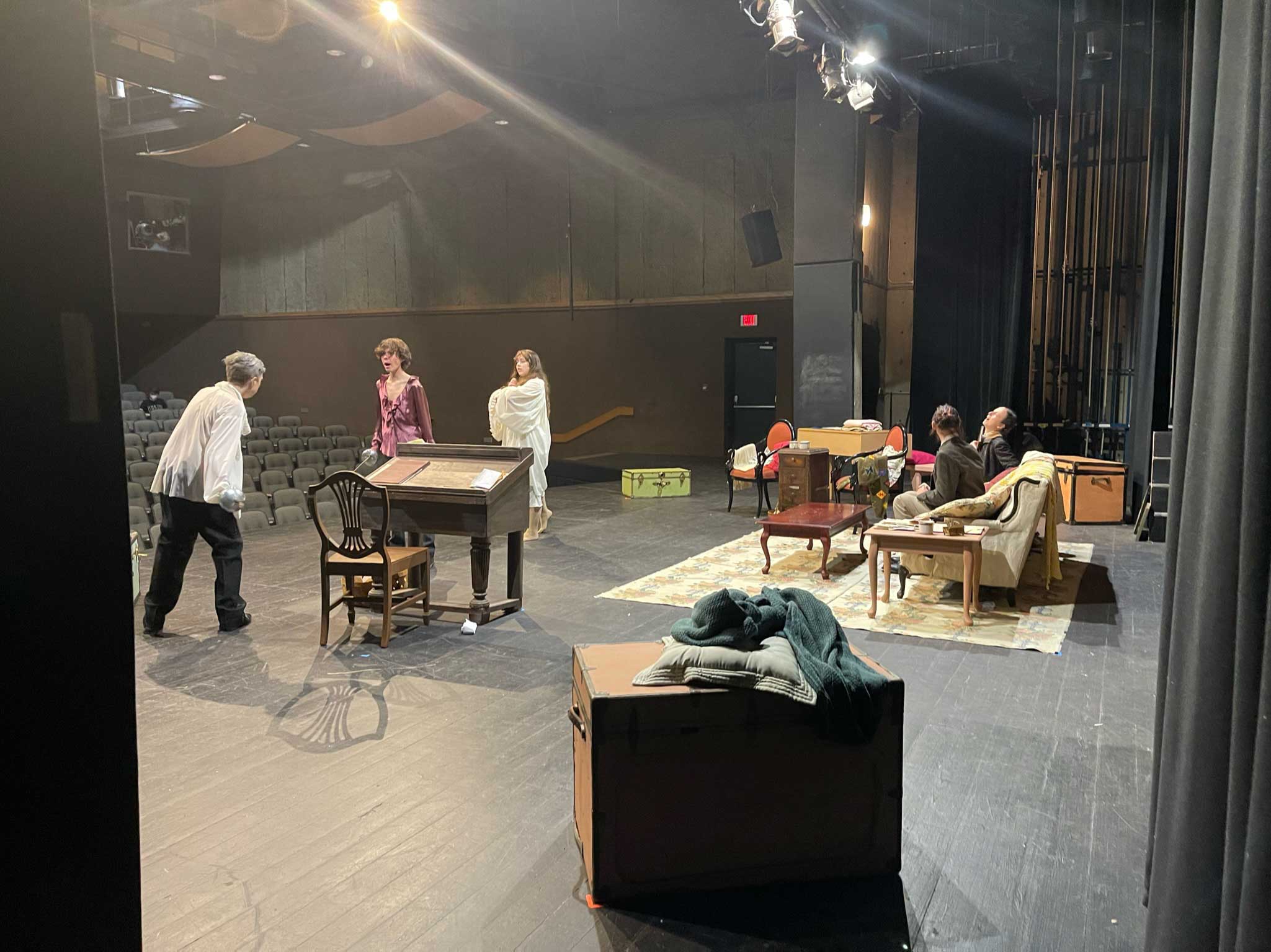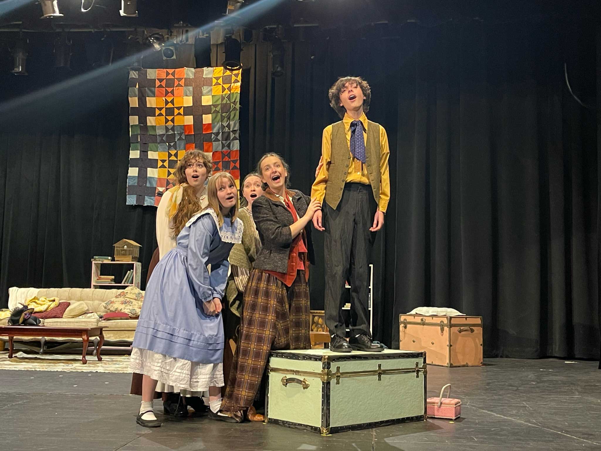The crew repaired, repainted and built scenic elements to fit the design brief, including a stairway, pianoforte, and vintage trunks reinforced for actors to stand on.