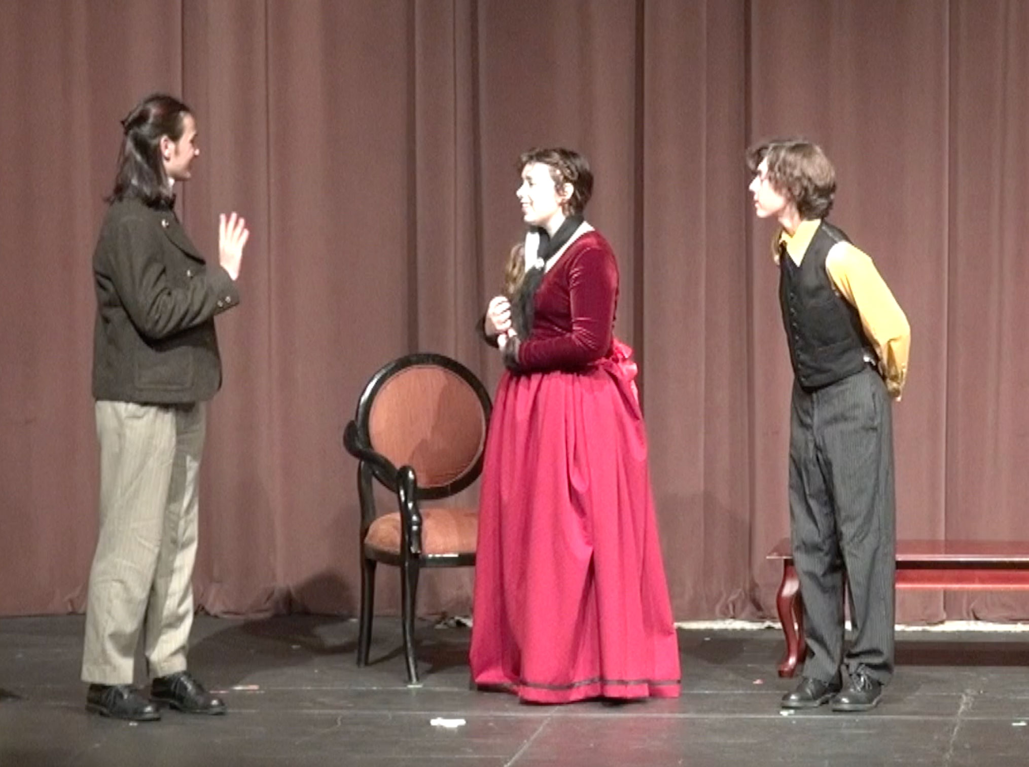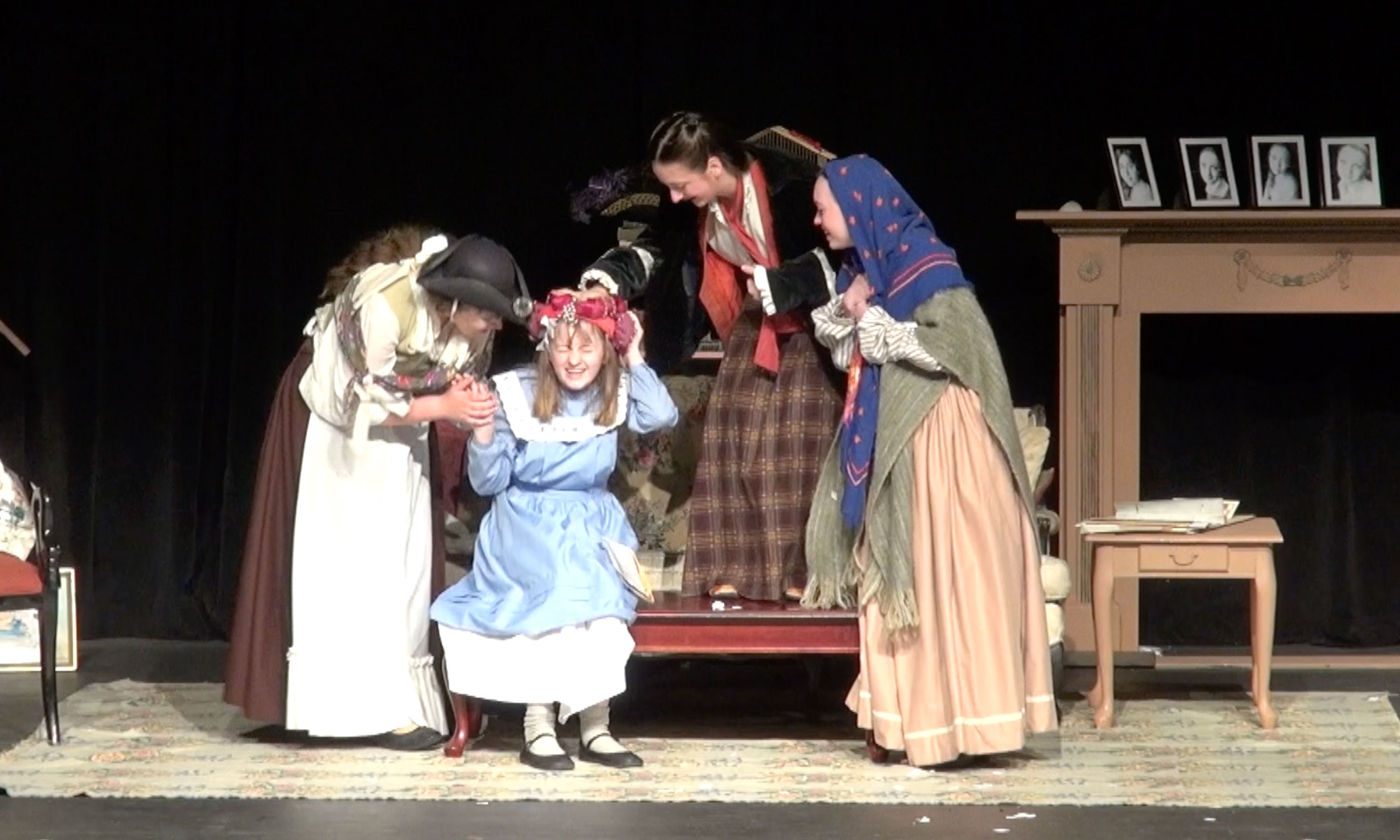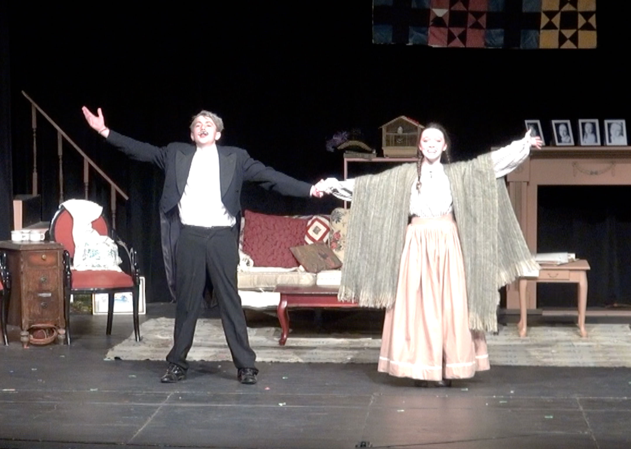 The crew repaired, repainted and built scenic elements to fit the design brief, including a stairway, pianoforte, and vintage trunks reinforced for actors to stand on.